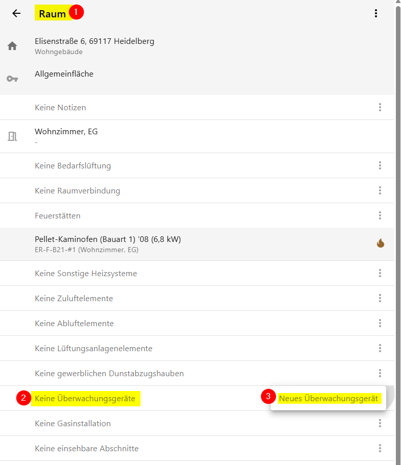 Um einen neuen RWM anzulegen, gehe zunächst in die entsprechende Nutzungseinheit und dort in den entsprechenden Raum. Existiert dieser noch nicht, lege ihn über die 3 Punkte im Bereich Räume einfach neu an. Im Raum (1) gibt es dann den Bereich der Überwachungsgeräte (2). Füge hier über die 3 Punkte ein neues Überwachungsgerät hinzu (3).