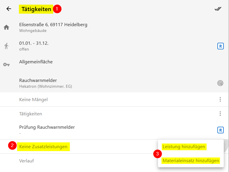 Gehe in die Begehung und dann in die Tätigkeit (1). Über die 3 Punkte im Bereich der Zusatzleistungen (2) füge nun eine Leistung und/oder einen Materialeinsatz hinzu (3) und fülle die anschließende Maske vollständig aus. Wenn du mehrere Punkte für Material/Leistungen auf der Rechnung listen möchtest, füge für jeden Eintrag eine eigene Leistung/Materialeinsatz hinzu.