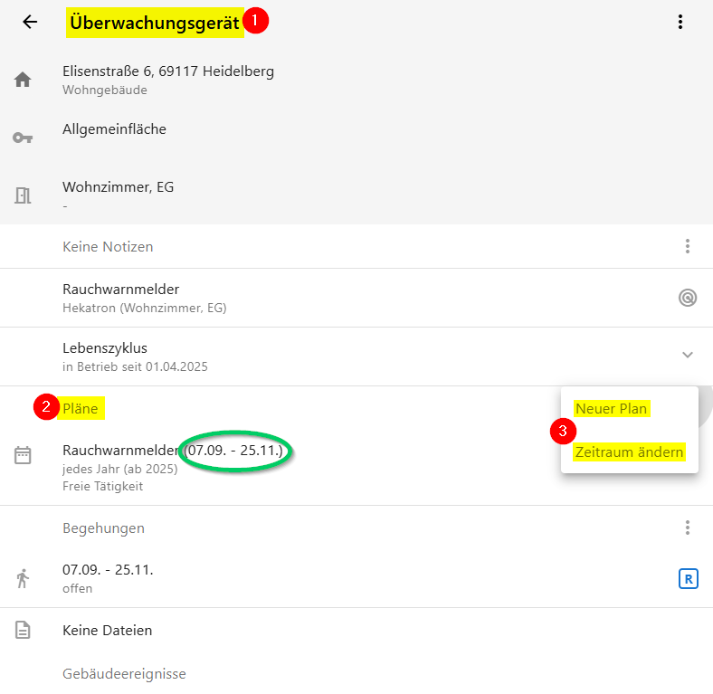 Gehe in den RWM (1) und prüfen die Einträge im Bereich der Pläne (2). Wenn hier ein Plan eingetragen ist, prüfe die Frist. Wenn hier kein Eintrag hinterlegt ist, sollte dieser generiert werden. In beiden Fällen gehe auf die 3 Punkte (3) und erstelle entweder einen neuen Plan oder ändere den Zeitraum.