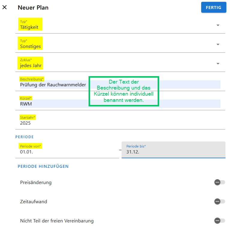 Für einen neuen Plan wähle den Typ Tätigkeit und Sonstige aus. Setze den Zyklus auf jedes Jahr. Die Beschreibung und das Kürzel sind Pflichtfelder und können individuell benannt werden. Jetzt trage nur noch das Startjahr und die Periode ein, bestätige mit fertig und schon ist dein Plan erstellt. connect kann nun die Begehung generieren/den RWM in die Begehung integrieren.