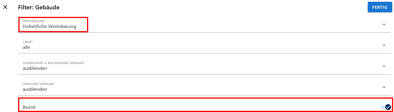 Im Gebäudefilter können nur Gebäude mit hoheitlicher Vereinbarung und der eigene Kehrbezirk ausgewählt werden,
