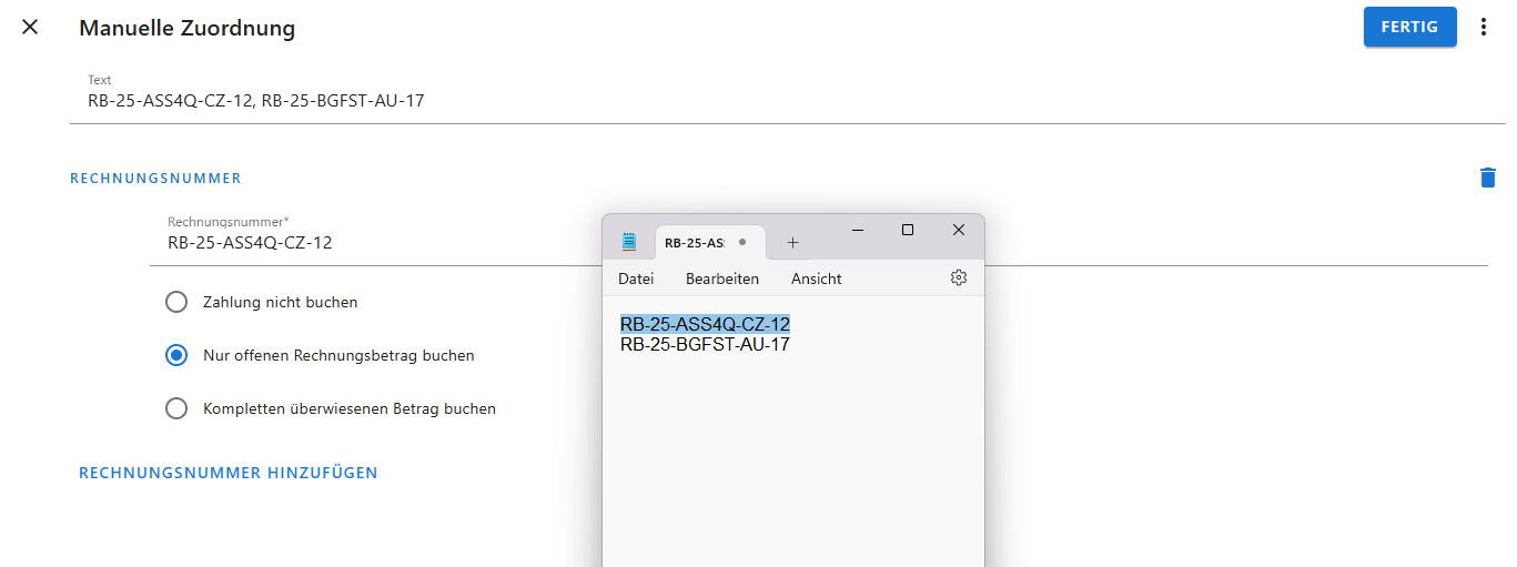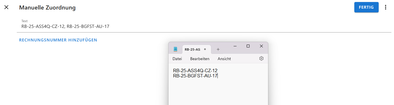 5. Über "Rechnungsnummer hinzufügen" weitere Rechnungen eintragen und auf "Fertig" klicken.
