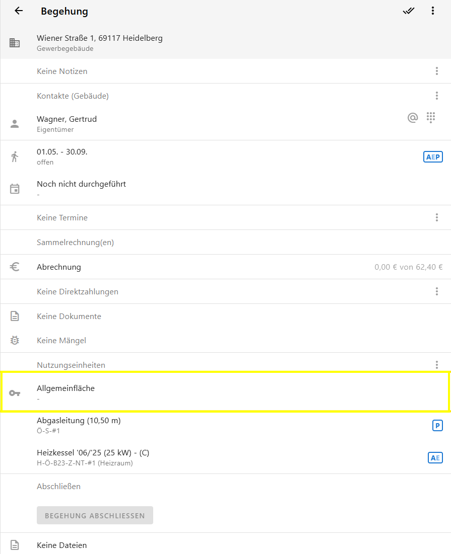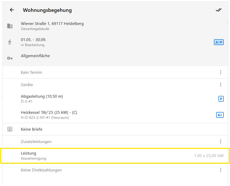 Antwort: Überprüfe, ob die Begehung abgeschlossen und korrekt in den Rechnungslauf einbezogen wurde. Stelle zudem sicher, dass die Leistung noch in der Detailansicht der Begehung (siehe Abb. 8) aufgeführt ist.