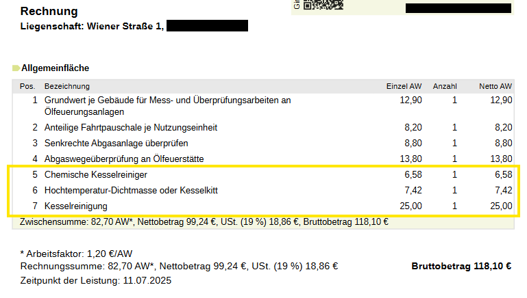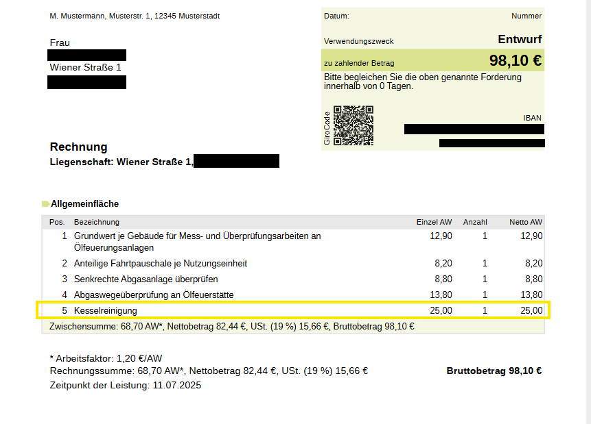 Beschreibung: Ein aussagekräftiger Name für die Leistung, der auf der Rechnung erscheint (z. B. "Kesselreinigung").