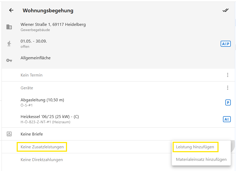 Öffne eine Wohnungsbegehung (auf die Begehung, dann auf die Nutzungseinheit). Scrolle zum Bereich Zusatzleistungen und klicke auf die drei Punkte. Wähle dort Leistung hinzufügen.
