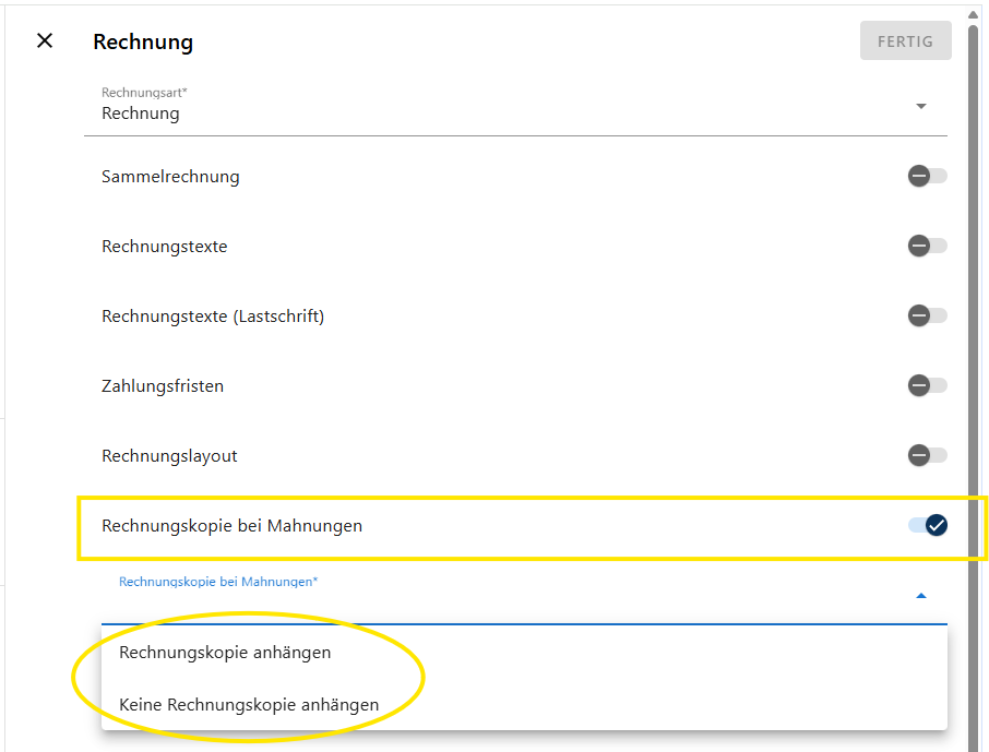 - Aktiviere den Schieberegler bei Mahnungen mit Rechnungskopie. Der Regler und das Häkchen färben sich blau.