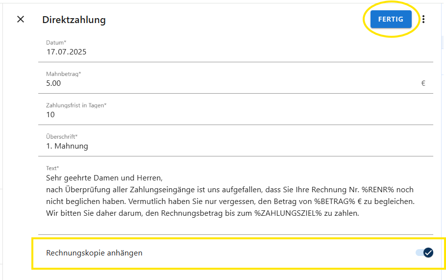 - Klicke auf FERTIG, um die Mahnung zu finalisieren.