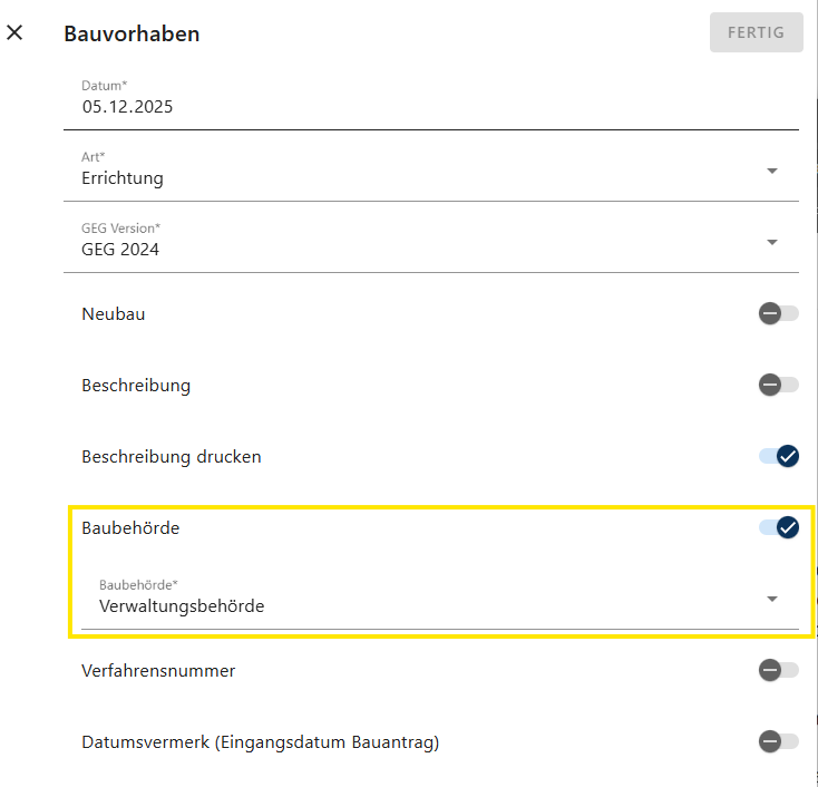 Um die Baubehörde bei der Bauabnahme auszuwählen, ist es erforderlich, dass diese zuvor unter Einstellungen - Behörden angelegt ist.
