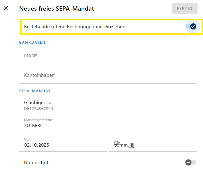 Wenn in digibase connect Überweisungsrechnungen erstellt und versendet wurden, kann nun beim Hinzufügen eines SEPA Mandates festgelegt werden, ob die bestehenden, offenen Rechnungen eingezogen werden sollen.