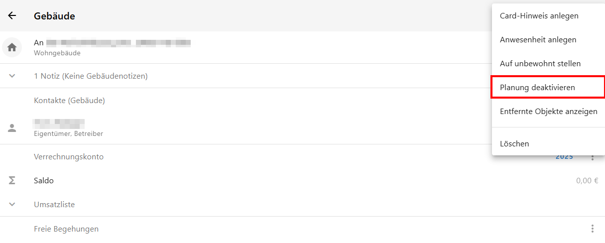 Die Funktion "Planung deaktivieren" findet sich im Kontextmenü des Gebäudes: