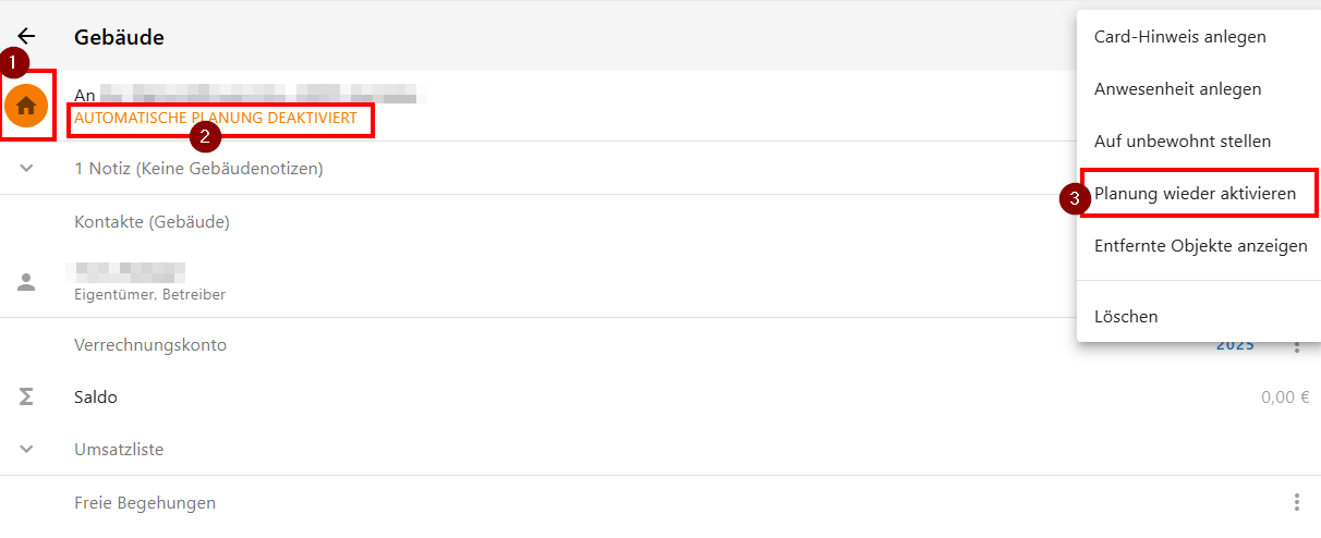 Dass die autom. Planung aktuell deaktiviert ist, könnt ihr daran erkennen, dass das Gebäude-Listenelement ein orangenes Haus-Symbol (1) und den Text "AUTOMATISCHE PLANUNG DEAKTIVIERT" (2) enthält. Selbstverständlich könnt ihr die "Planung wieder aktivieren" (3) und der Planer wird wieder seine Arbeit aufnehmen.