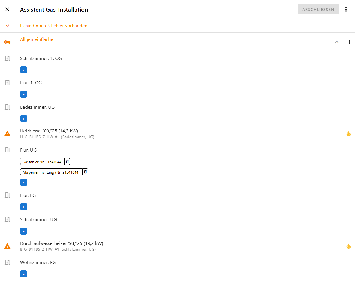 Die Übersicht ist im mobilen Stil von connect gehalten. Ganz oben werden euch von connect Hinweise und Korrekturvorschläge gegeben, darunter seht ihr die strukturierte Aufteilung des Gebäudes nach Nutzungseinheiten und Räumen. Die Gasfeuerstätten und die Gashausschau-Technik stehen klar im Fokus dieser Ansicht, daher ist auch alles andere ausgeblendet.