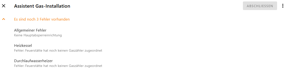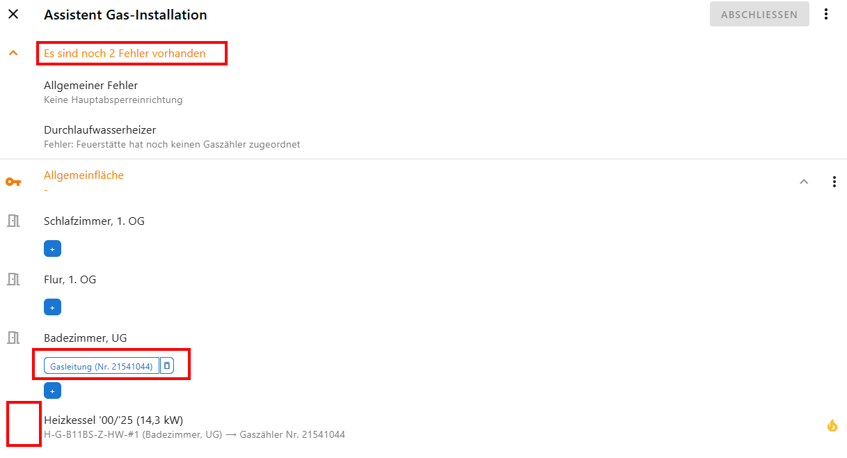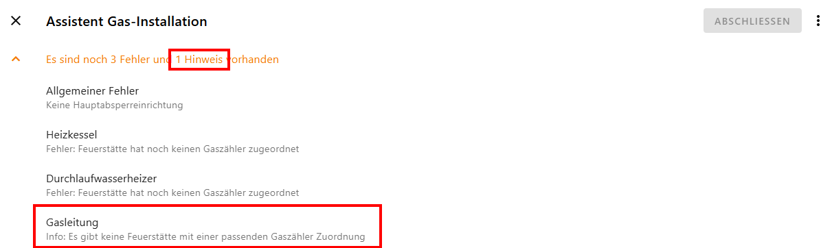 Klappt man die von connect festgestellten und oben angegebenen "Fehler" auf, kommen die Korrekturhinweise zum Vorschein. In diesem Beispiel gibt es keine Hauptabsperreinrichtung (dafür aber eine Absperreinrichtung, die für das Gashausschau-Protokoll ausreicht) und die Gas-Feuerstätten sind keinem Zähler zugeordnet. Für das Gashausschau-Protokoll würde natürlich auch noch eine Gasleitung fehlen. Diese werden im Assistenten als Hinweise angezeigt, sobald eine Feuerstätte verbunden ist.