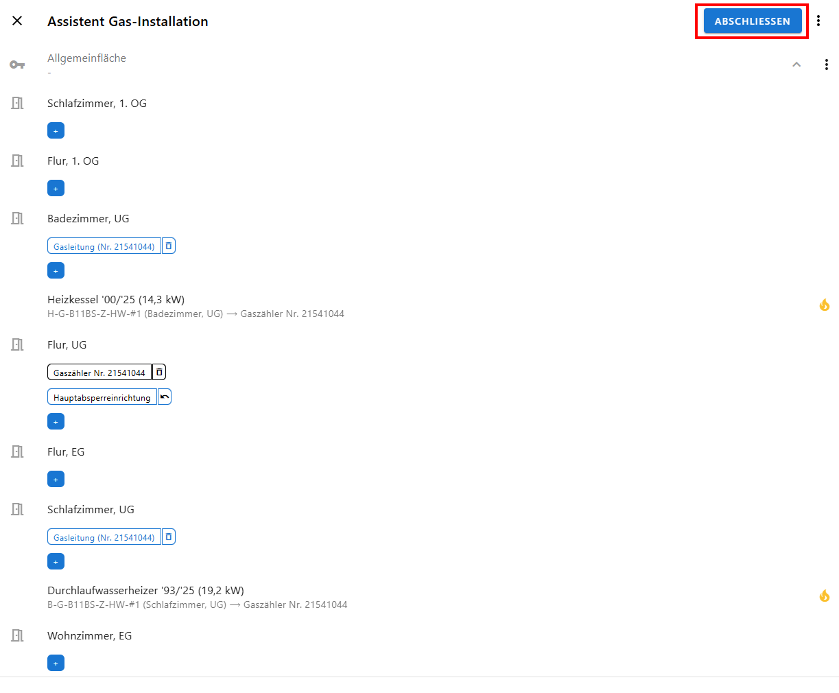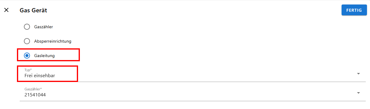 wählen Gasleitung und den Typ aus. Der Gaszähler ist vorbelegt, weil es nur einen in dem Gebäude gibt.