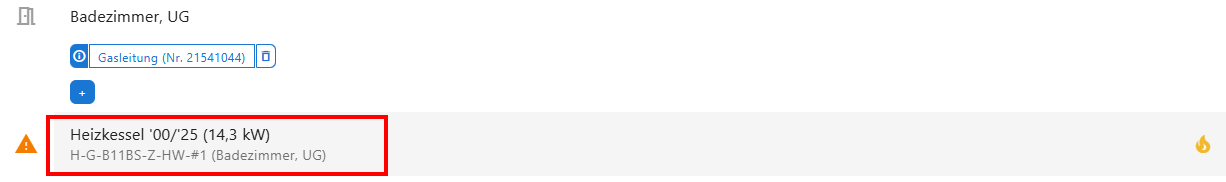 Nach der Anlage der Gasleitung zeigt uns der Assistent einen zusätzlichen "Hinweis" von der Gasleitung an. Es gibt keine Feuerstätte an diesem Gaszähler, also auch nicht an dieser Gasleitung.