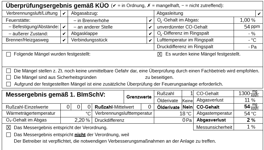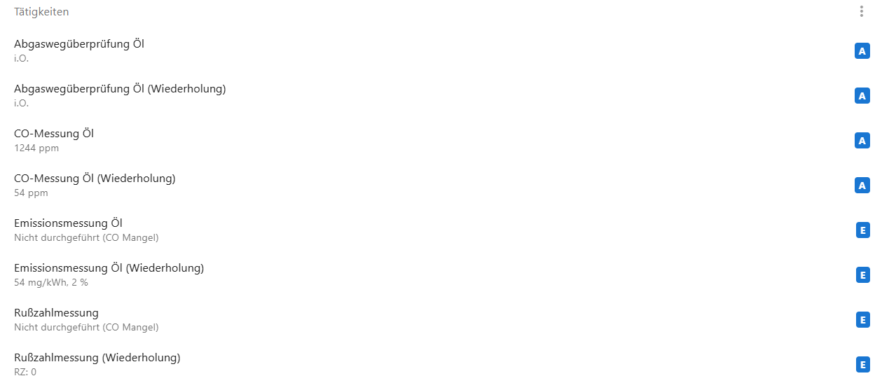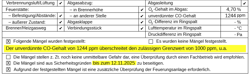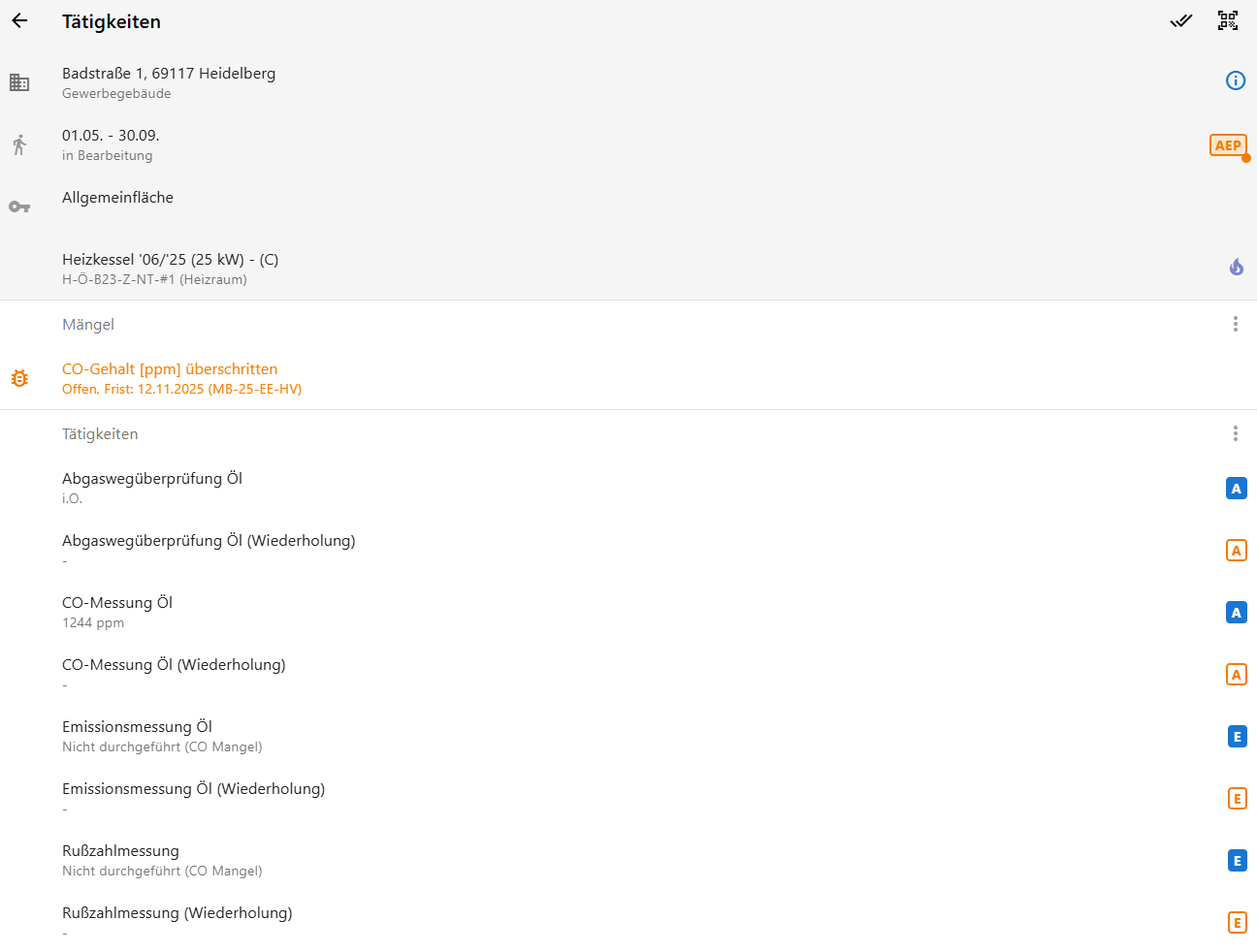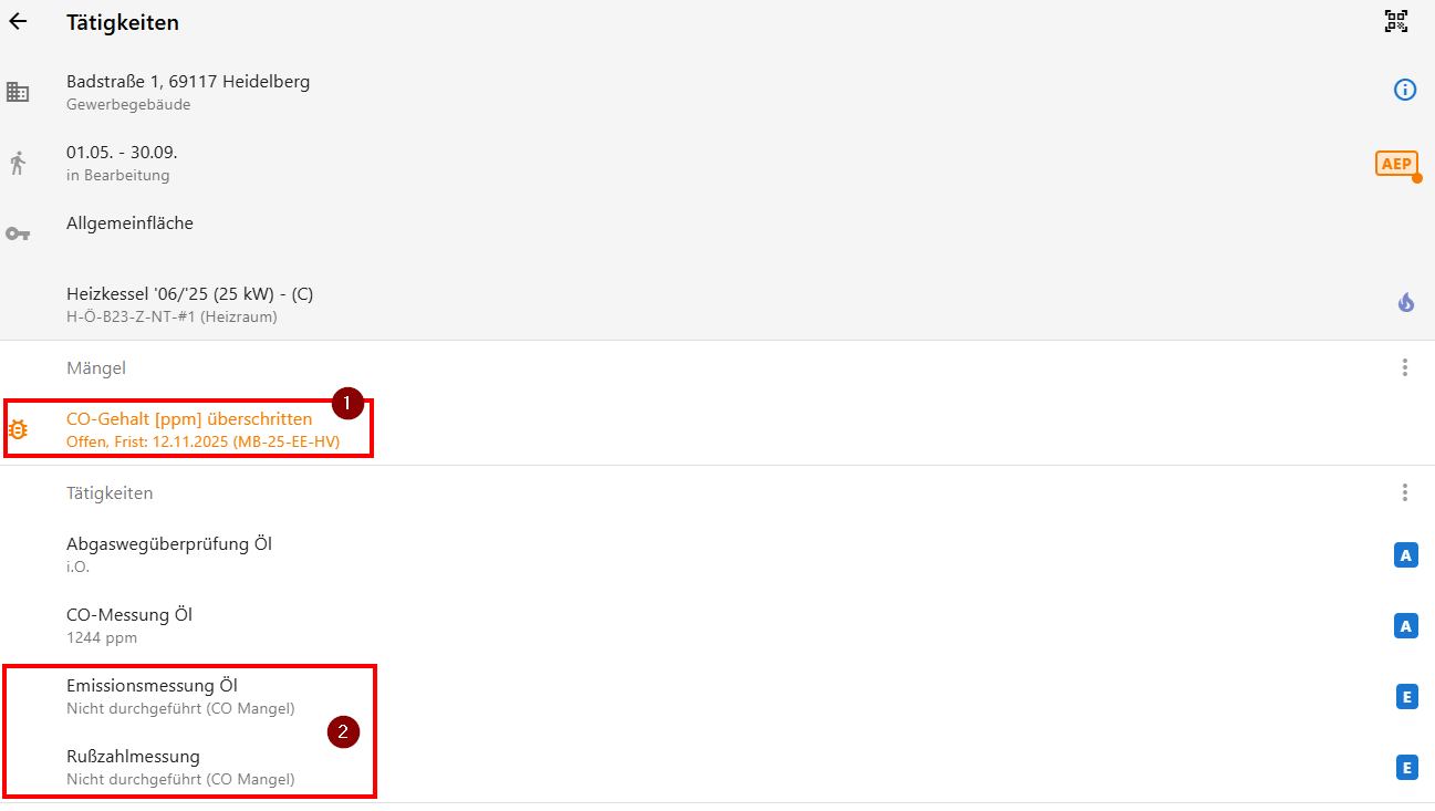 Als Beispiel haben wir hier am 01.10.2025 bei der CO-Messung einen Wert von 1244 ppm gemessen (also weit über dem Grenzwert von 1000 ppm). Nach Bestätigung der Messwerte wurde automatisch ein Mangel angelegt (1). Anschließend wurde auf die Emissions- und Rußzahlmessung verzichtet (2).