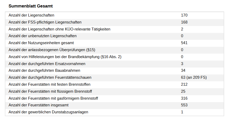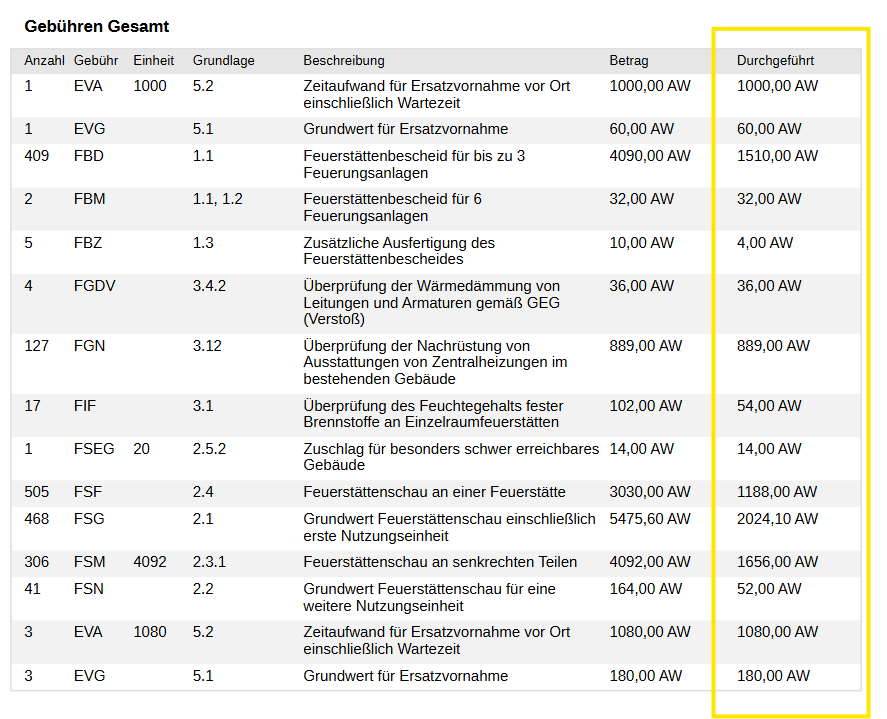 Die Daten für den Reiter "Hoheitliche Daten" können den Gebühren Gesamt entnommen werden. Relevant ist hier die Spalte "Durchgeführt", diese bezieht sich auf das Jahr, in dem das Kehrbuch erstellt wurde.