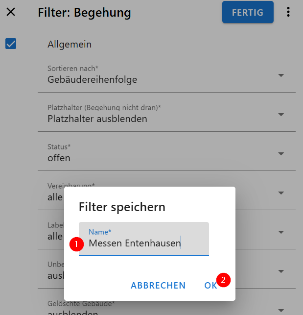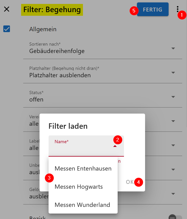 - Der Filter ist nun geladen und kann bei Bedarf noch angepasst werden oder aber sofort mit "fertig" (5) bestätigt und somit geladen werden.