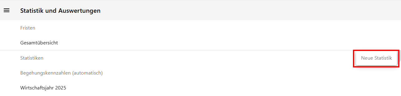 Ihr findet die Option zur Erstellung dieser Übersicht im Menüpunkt "Statistik", dort, wo ihr auch die Statistik für das aktuelle Wirtschaftsjahr erstellen könnt. Beim ersten Mal erstellt ihr sie über das 3-Punkte-Menü mit "Neue Statistik". Es kann zu jedem Zeitpunkt nur eine "Übersicht Bestellzeitraum" existieren.