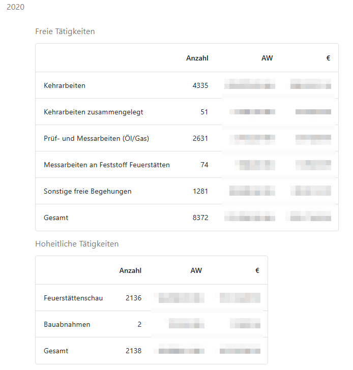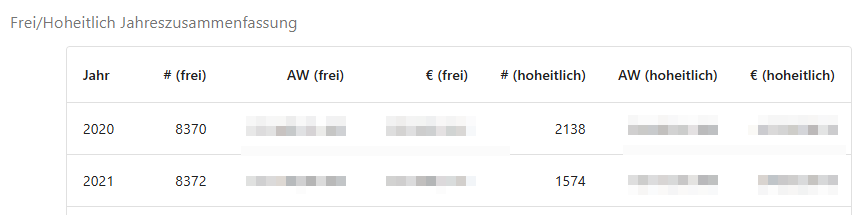 Eine erfolgreich erzeugte Statistik zeigt euch eine jährliche Zusammenfassung mit dem Jahr, der Anzahl der freien/hoheitlichen Begehungen sowie der AW daraus und den (geschätzten) Einnahmen (Abweichungen sind möglich).