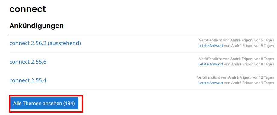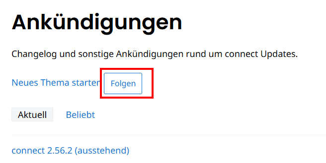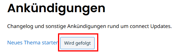 Hier könnt ihr euch an unterschiedlichen Diskussionen beteiligen und diese abonnieren, aber um die regelmäßigen E-Mails zu Update-Ankündigungen zu erhalten, klickt ihr bei Ankündigungen auf "Alle Themen ansehen"
