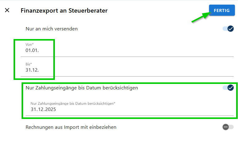 - Aktiviere "Nur Zahlungseingänge bis Datum berücksichtigen" und trage das gewünschte Datum ein (in diesem Beispiel: 31.12.2025).