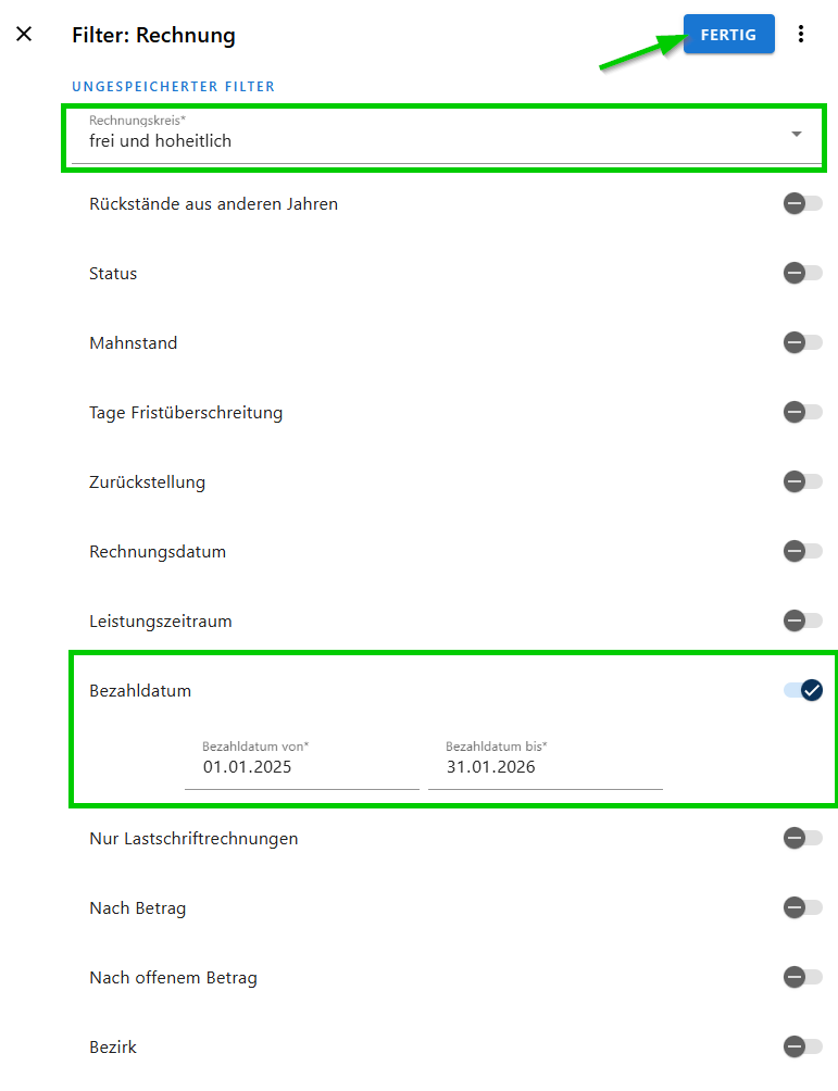 - Setze den Filter: Rechnungskreis frei und hoheitlich, Rechnungsdatum mit gewünschtem Zeitraum (z.B. 01.01.2025 - 31.01.2026) - mehr nicht, nur diese beiden Punkte!