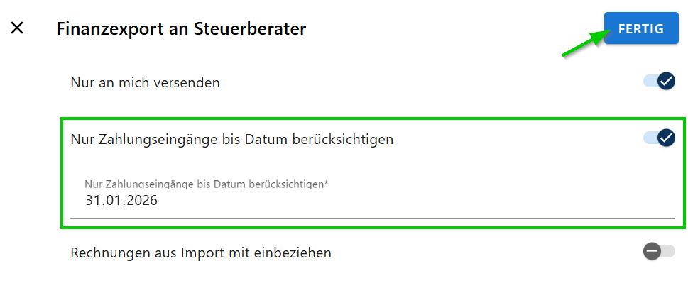 - Aktiviere "Nur Zahlungseingänge bis Datum berücksichtigen" und trage das gewünschte Datum ein (in diesem Beispiel: 31.01.2026).