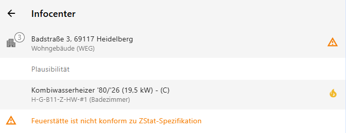 Mit connect Version 2.60.3 wurde in connect der ZStat-Validator hinzugefügt. Der ZStat-Validator zeigt Feuerstätten an, die nicht konform zu ZStat-Spezifikationen sind.