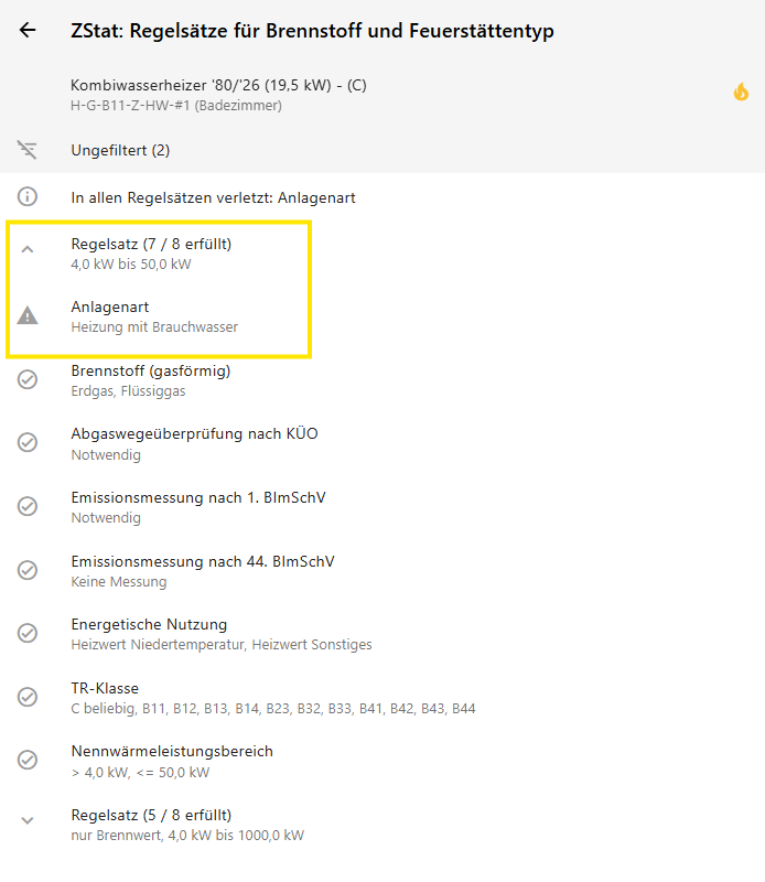 Mit Klick auf "Feuerstätte ist nicht konform zu ZStat-Spezifikation" werden die Verletzungen angezeigt. Es werden verschiedene Regelsätze angezeigt, jeder Regelsatz steht für eine bestimmte Kombination aus