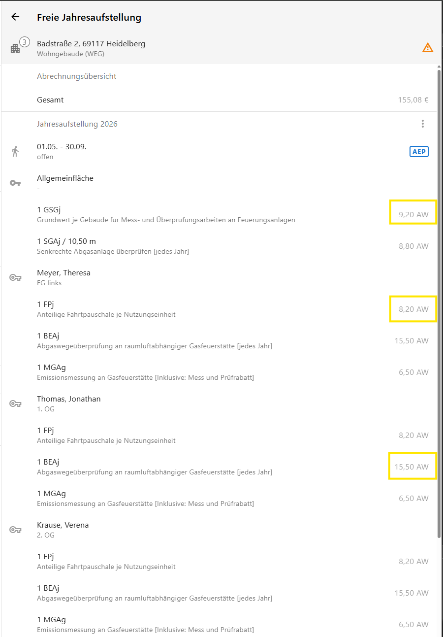 Über Gebäude > Freie Begehungen > Leistungen und Preise gelangst du direkt in die Jahresaufstellung des laufenden Jahres. Dort kannst du durch Klick auf den jeweiligen AW-Wert Preise dauerhaft anpassen. Die Änderung wird automatisch an der richtigen Stelle im Gebäude gespeichert. Die bekannten Wege über Freie Vereinbarung oder individuelle Tätigkeitspreis-Anpassungen bleiben weiterhin bestehen.